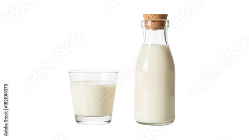 Fresh milk in glass and bottle, showcasing creamy texture and natural color, perfect for various culinary uses