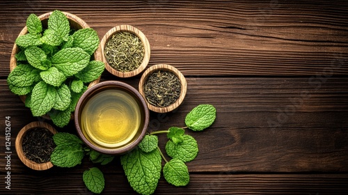 Fresh Mint Leaves and Green Tea in Rustic Wooden Setting