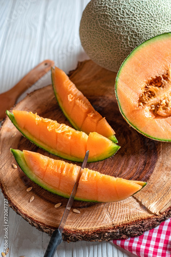 Fresh of whole and sliced orange melon or cantaloupe on wooden cutting board and background wooden table. Favorite fruit in summer concept.