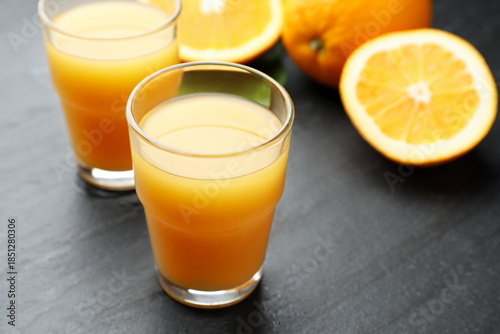 Fresh orange juice and fruits on black table, closeup