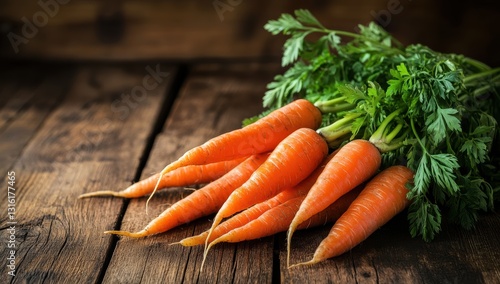 Fresh organic carrots with green leaves placed on a rustic wooden background vibrant orange color healthy and natural vegetable