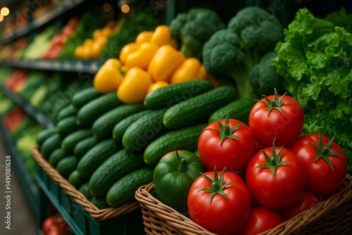 Fresh Organic Vegetables Market Display Colorful Tomatoes Cucumbers Peppers Green Healthy Food Produce Grocery Shop Vibrant Ripe Farm Stand Natural Ingredients Delicious Vitamins diet store salad
