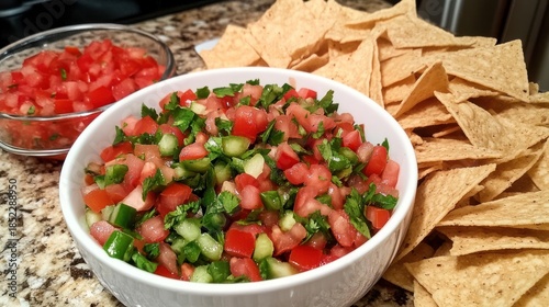 salsa, fresh, tomatoes, cilantro, onion, jalapeno, cucumber, chips, tortilla, corn, dip, snack, mexican, food, cookery, healthy, vegetarian, homemade, delicious, colourful, ingredient, party, gathering, sharing, side dish, refreshing, zesty, flavorful, natural, organic, raw, chopped, diced, bowl, plate, closeup, topview, overhead, bright, vibrant, summer, traditional, authentic, simple, easy, quick