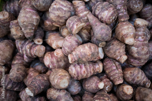 Fresh pink Jerusalem artichoke in box for sale in the market