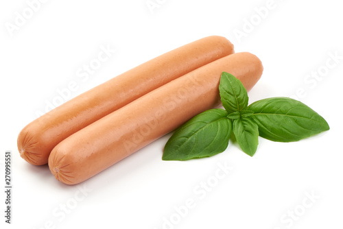 Fresh pork Boiled sausages with basil, close-up, isolated on white background