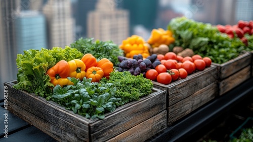 Fresh Produce Displayed on Rooftop Garden with Colorful Vegetables and Lush Greens Against Urban Skyline Background