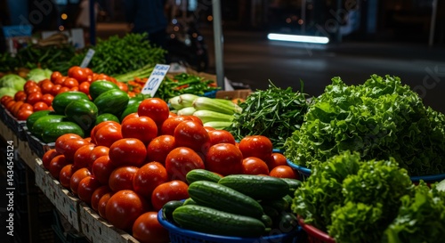 tomatoes, cucumber, avocado, lettuce, vegetable, market, stall, night, fresh, produce, healthy, eating, farm, food, green, display, vibrant, organic, diet, nourishment, grocery, shopping, local, farmer, racked, harvest, summer, spring, garden, vitamin, delicious, tasty, crisp, juicy, ripe, natural, clean, lifestyle, agriculture, shop, buying, selling, good, abundance