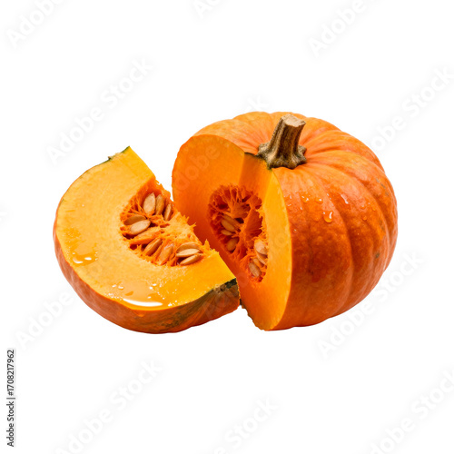 Fresh Pumpkin with Slice Showing Seeds and Moist Flesh Isolated on Black
