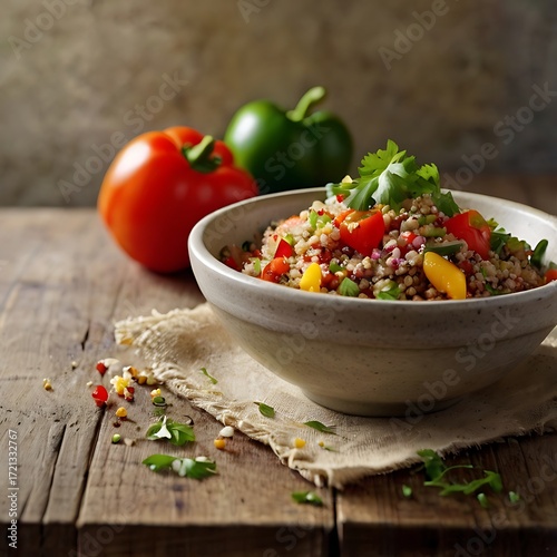 Fresh quinoa tabbouleh salad with tomatoes, peppers and cucumbers