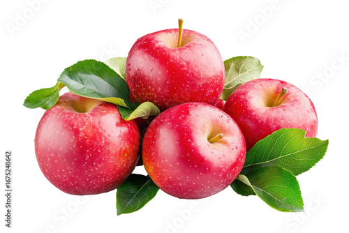 Fresh red apples with green leaves arranged in a cluster, showcasing their vibrant color and appealing texture, perfect for autumn decorations or healthy snacks
