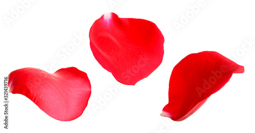 Fresh red rose petals on white background