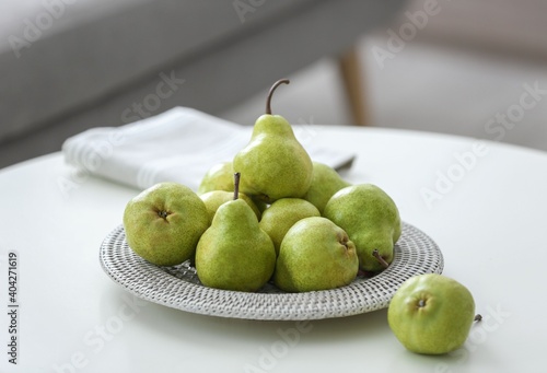 Fresh ripe pears on white table in room