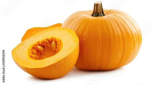 pumpkin, fresh, ripe, cut, isolated, white, halloween, orange, vegetable, harvest, decoration, autumn, slice, food, nature, organic, culinary, festive, seed, round, colours, leaf, plant, cooking, ingredient, dessert, soup, receipe, arrangement, display, photo, still, background, market, farm, produce, cookery, health, treat, carving, holiday