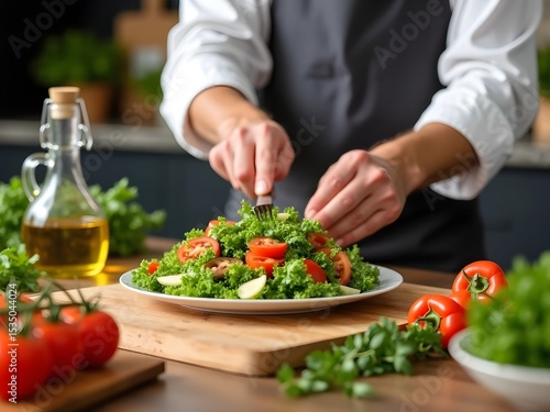 Fresh Salad Preparation on Kitchen Counter with Olive Oil and Herbs – Modern Kitchen Background