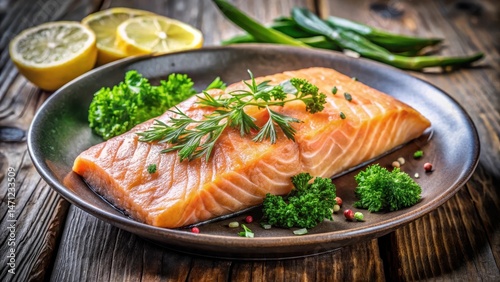Fresh salmon fillet sizzling on a plate with a squeeze of lemon and sprigs of parsley and dill , fine dining, gourmet salmon dish