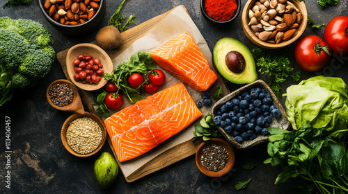 Fresh Salmon Fillet Surrounded by Variety of Healthy Ingredients Including Vegetables, Nuts, and Berries on Dark Background