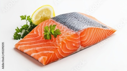 Fresh Salmon Fillet with Lemon Slice and Green Herbs on White Background