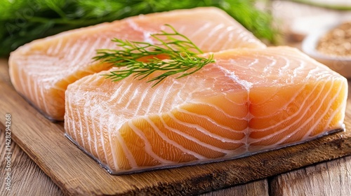 Fresh salmon fillets on a wooden cutting board, garnished with dill, showcasing rich color and texture, ideal for culinary preparations.