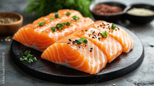 Fresh salmon fillets on black wooden plate, garnished with green onions and sesame seeds, showcasing vibrant colors and textures. Perfect for sushi or sashimi lovers