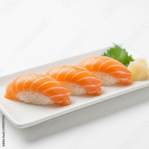 sushi, salmon, japanese food, seafood, raw fish, sake, fresh, rice, plate, white background, isolated, healthy, epicure, cookery, traditional, ginger, gari, perilla, leaf, meal, dinner, lunch, delicious, protein, raw, sliced, fillet, orange, minimalist, clean, bright, eatery, asian, diet, nourishment, culinary, food photography, tasty, high-quality, wasabi, sashimi, authentic, presentation
