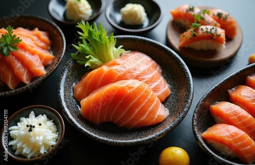 Fresh salmon sashimi and nigiri arranged on dark plates. Sliced raw fish served with pickled ginger and green garnish. Asian seafood dish ready to eat.