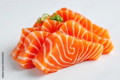 Fresh Salmon Sashimi Photography: Bright Orange Slices with Scallion Garnish on White Background