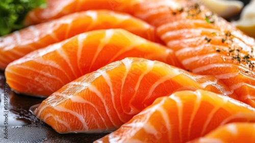 Fresh salmon sashimi slices close-up on a dark surface, garnished with herbs, with lemon visible in background