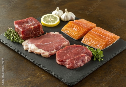 Fresh Selection of Raw Meats and Fish on a Slate Board Including Beef, Salmon, Lemon, Garlic, and Herbs for Culinary Enthusiasts