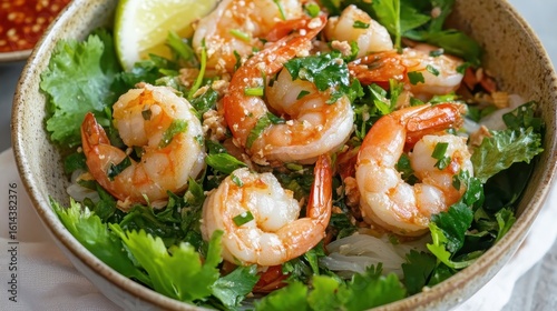 shrimp, salad, herb, lime, cilantro, seafood, freshness, dish, garnish, meal, cookery, table, nourishment, vibrant, ingredient, preparation, food, cooking, serving, bowl, plating, summer, favor, light, appetising, healthy, culinary, tasty, household, receipe, herbal, colourful, epicure, life events, texture, presentation, enjoyment, dining, organic, rustic, wholesome, bite, succulent, natural
