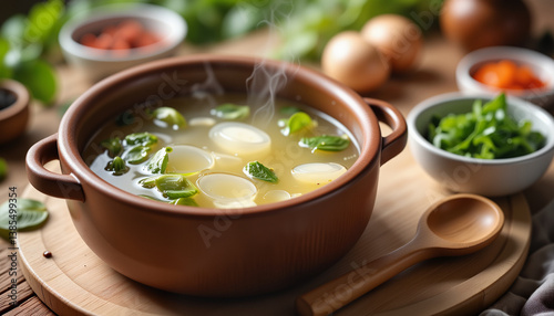 Fresh, steaming broth surrounded by ingredients on wooden table, comfort food