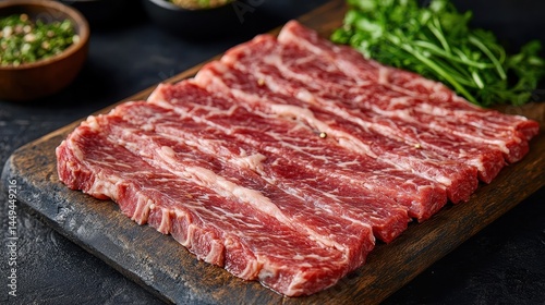 Fresh, thinly sliced raw beef with parsley on wooden board. This showcases meat for grilling or cooking delicious Asian dishes.