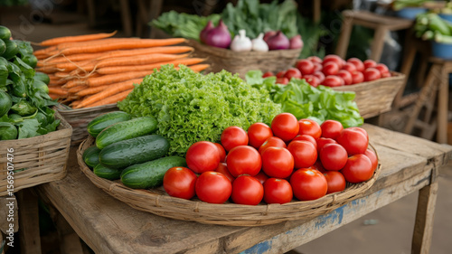 Fresh tomato, cucumber, carrot, lettuce, onion, and basil arranged on rustic wooden market table