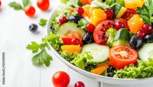 Fresh vegetable and fruit salad with tomatoes, cucumbers, olives, and greens in a white bowl