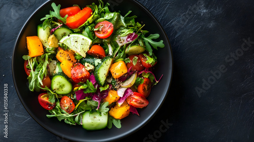 Fresh vegetable salad with cherry tomatoes, cucumber, bell peppers, and arugula in black bowl on dark textured background, garnished with lime and black pepper