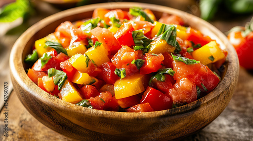 Fresh vegetable salad with tomatoes, bell peppers, cucumbers, and basil in a wooden bowl on a rustic table, perfect for healthy eating and Mediterranean cuisine