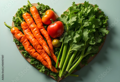 Fresh vegetables arranged in heart shape, featuring vibrant carrots, tomatoes, and leafy greens, symbolizing health and love for nature