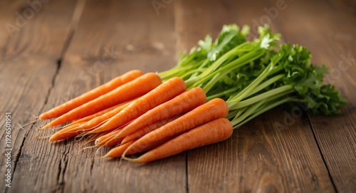 Fresh vegetables carrots and celery displayed orderly on a natural wooden table for cooking