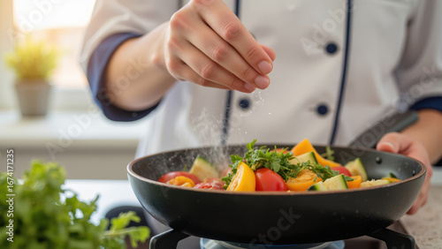 Fresh vegetables in frying pan, chef seasoning with herbs, vibrant colors, healthy cooking, culinary art, home kitchen