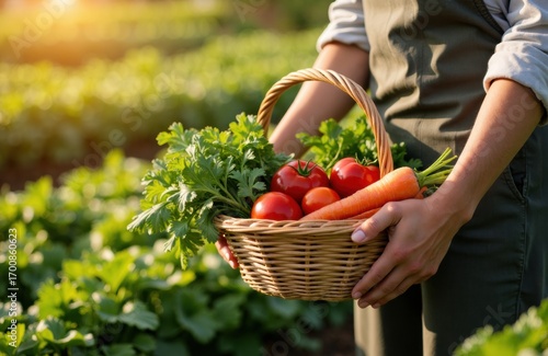 Fresh vegetables including tomatoes and carrots held in a basket by a person in a lush green farm field during golden hour