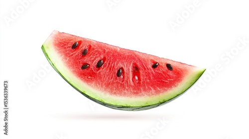 Fresh watermelon slice with black seeds and green rind on a pure white backdrop