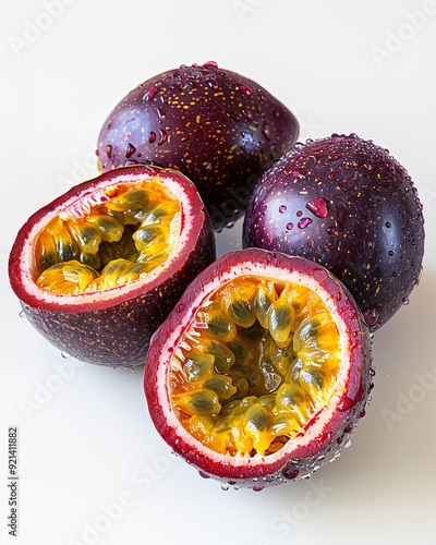 Fresh whole and cut passion fruits droplets of juice glistening on the surface on white background