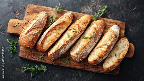 baguette, bread, baked, fresh, homemade, artisan, food, loaf, crust, yeast, flour, thyme, herb, spice, topping, dinner, lunch, breakfast, bakery, delicious, crispy, gold, healthy, organic, alimentary, diet, carb, grain, wheat, meal, snack, photo, closeup, top, view, wooden, board, cut, slice, tasty, receipe, easy, simple, ingredient, ready, eatery, cafes