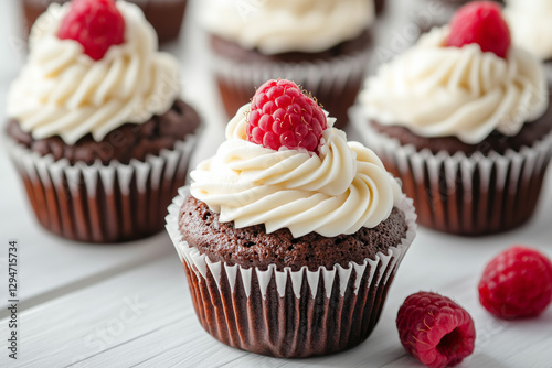 Freshly baked chocolate muffins with whipped cream on top with raspberries on white wooden kitchen background. Pastry concept.