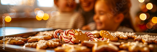 Freshly baked Christmas cookies with mother and child laughing in the background