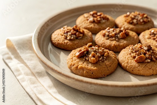 Freshly baked cookies with nuts displayed on a ceramic plate, set on a light-colored table