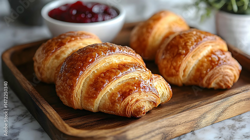 Freshly Baked Croissants with Fruit Jam on Rustic Wooden Tray