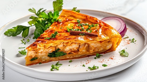 Freshly Baked Spinach and Tomato Quiche Pie Served on a Plate with Herbs