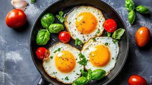 Freshly cooked eggs with vibrant tomatoes and basil in a skillet, creating a delicious breakfast scene.