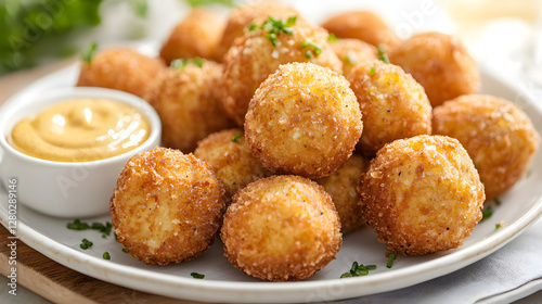 Freshly Fried Dutch Bitterballen Served on a White Plate with Mustard Sauce on the Side
