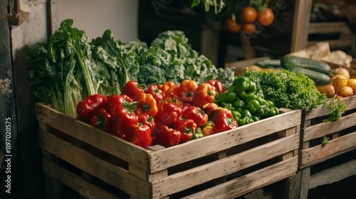 Freshly harvested vegetables are arranged in wooden crates at a bustling market. Green leafy vegetables, vibrant peppers, and cucumbers fill the crates, inviting shoppers to explore